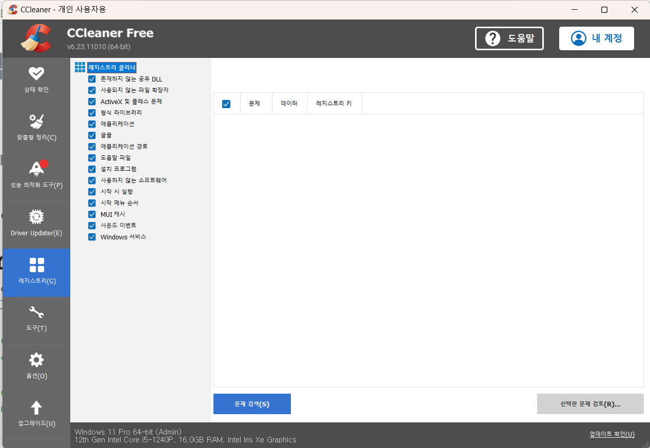 문제해결해준 고마운 프로그램이다. 위 링크에서 무료 다운로드 후, 아래 화면에서 레지스트리-문제 검색-선택한 문제 검토