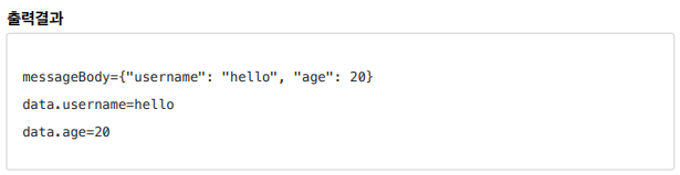 http://localhost:8080/request-body-json{"username": "hello", "age": 20}{"username": "hello", "age": 20} JSON 형식 파싱 추가