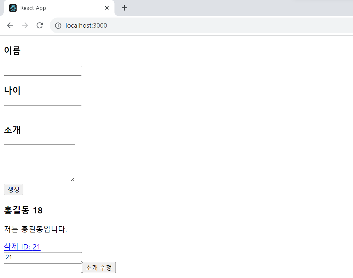 ※ 컴포넌트는 다른 파일에 작성해서 import로 가져와 사용해야 하지만 편의상 같은 App.js 파일에 CreateUser 컴포넌트를 만들었다.