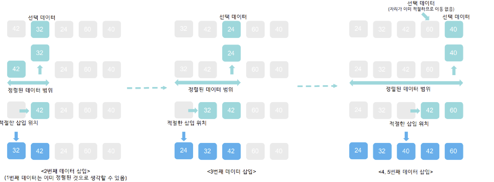 이미 정렬된 데이터 범위에 범위에 정렬되지 않은 데이터를 적절한 위치에 삽입시켜 정렬하는 방법