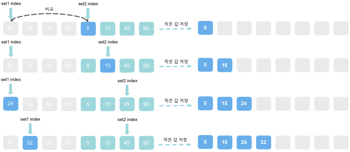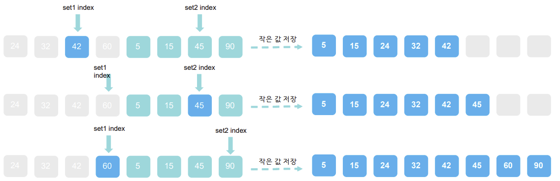<!-- 두 부분의 배열을 비교하면서 작은 값부터 복사 -->