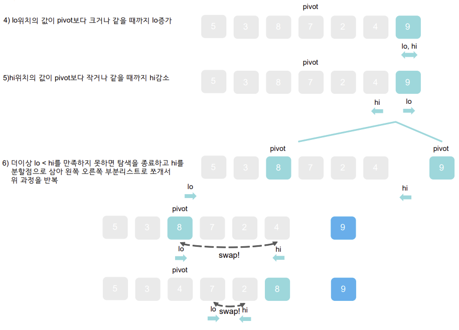 <!-- 교환 조건: low가 high를 지나치지 않았으면 서로 교환 -->