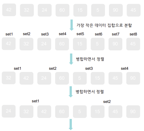 <!-- 한 단계마다 두 개의 정렬된 구간을 병합하여 구간 크기를 두 배로 늘림