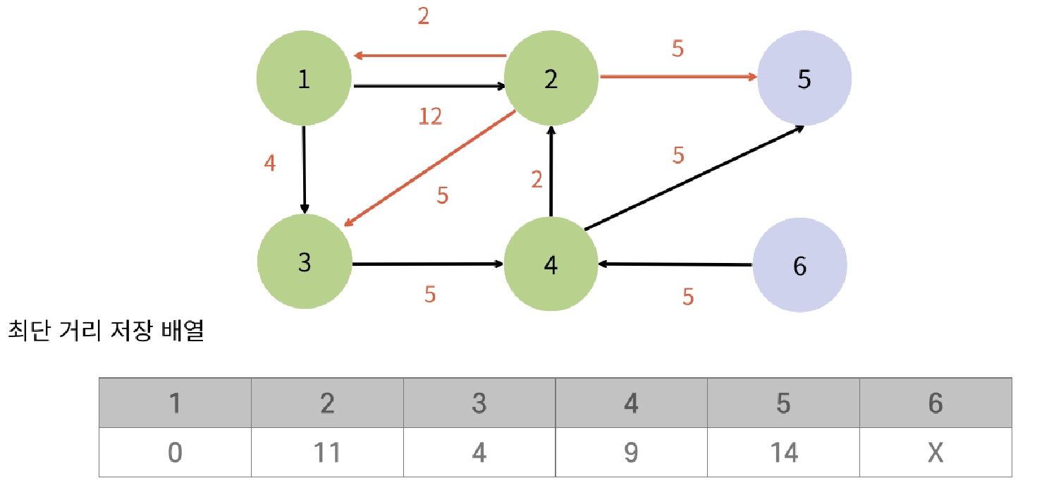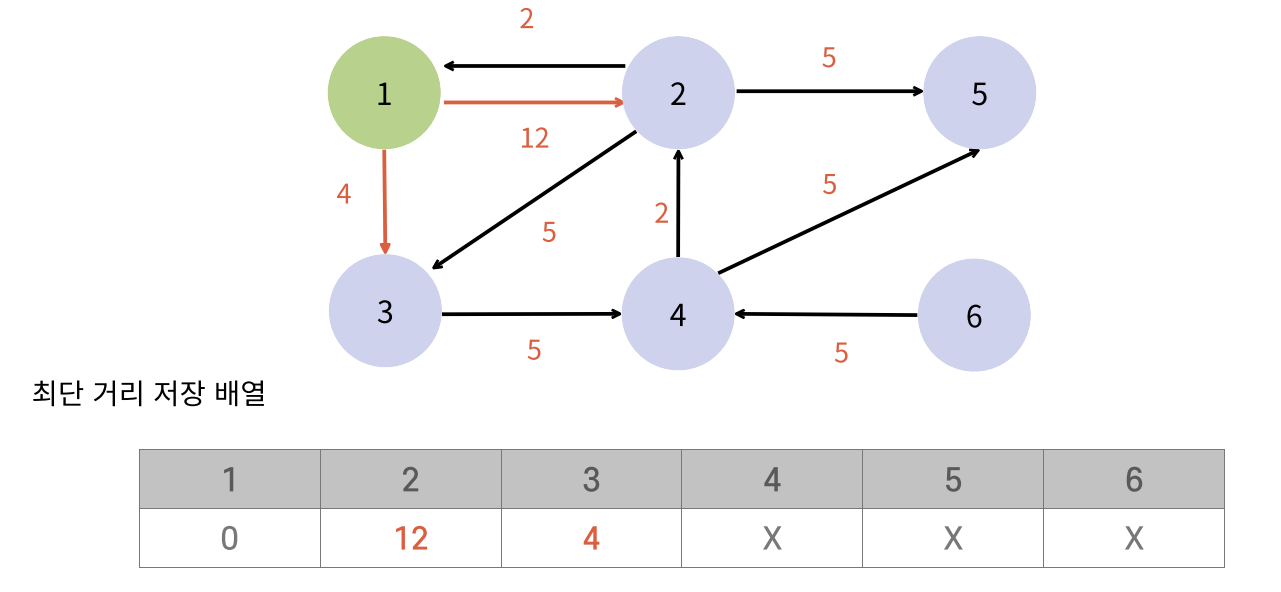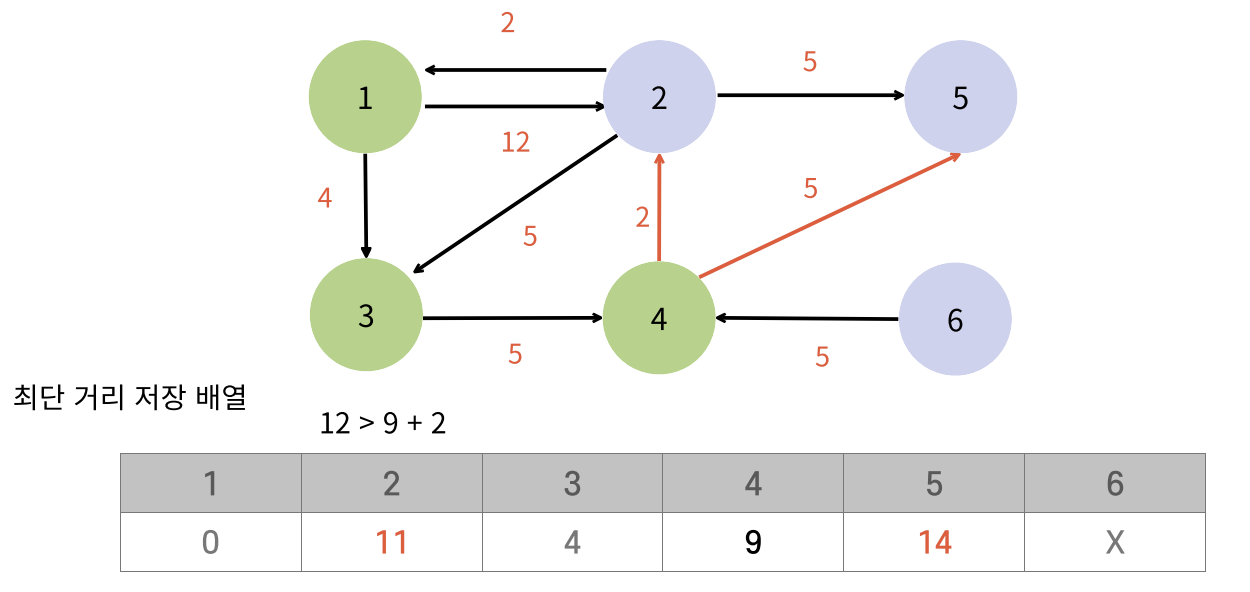 <!-- 현재까지 거리 + 간선의 가중치 < 기존 저장 거리 -->
