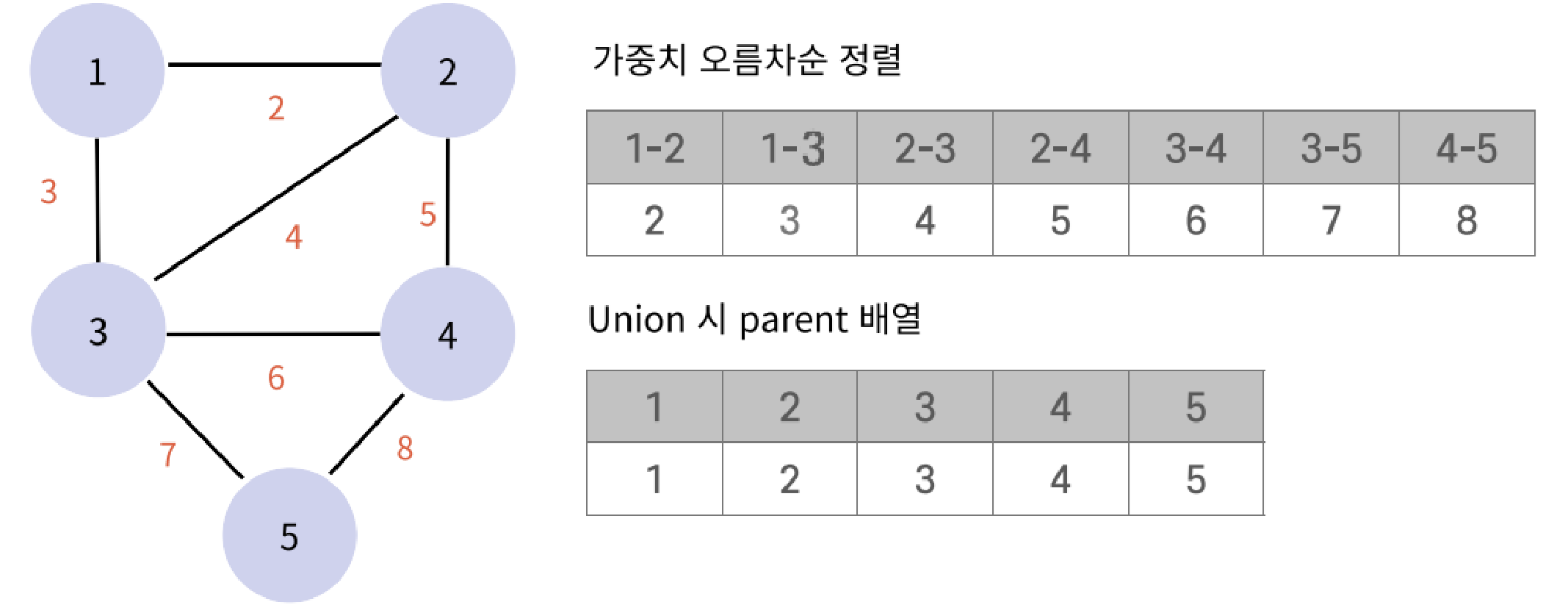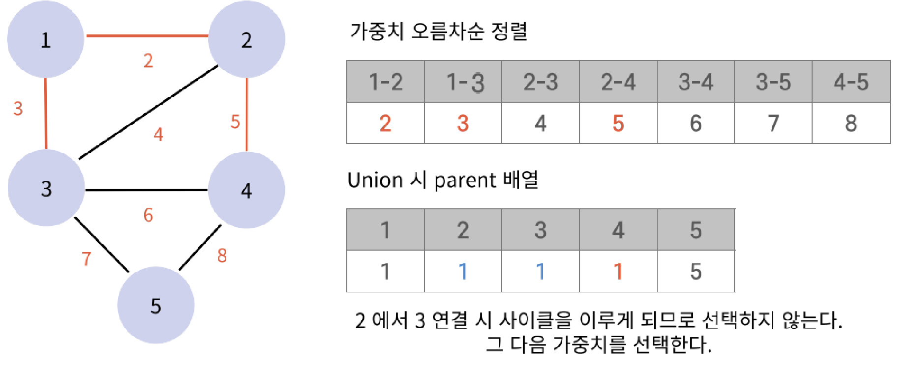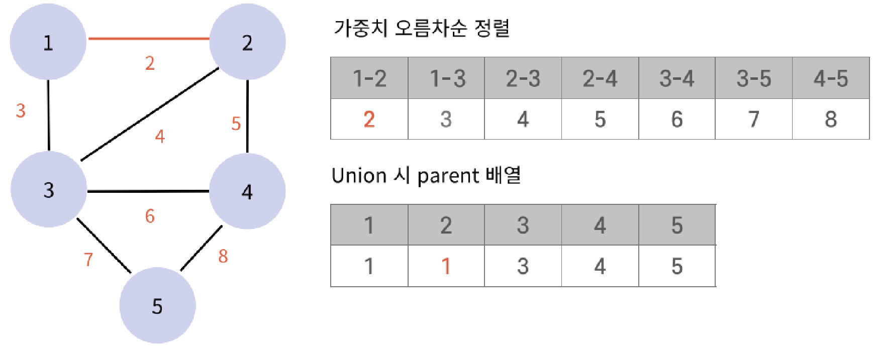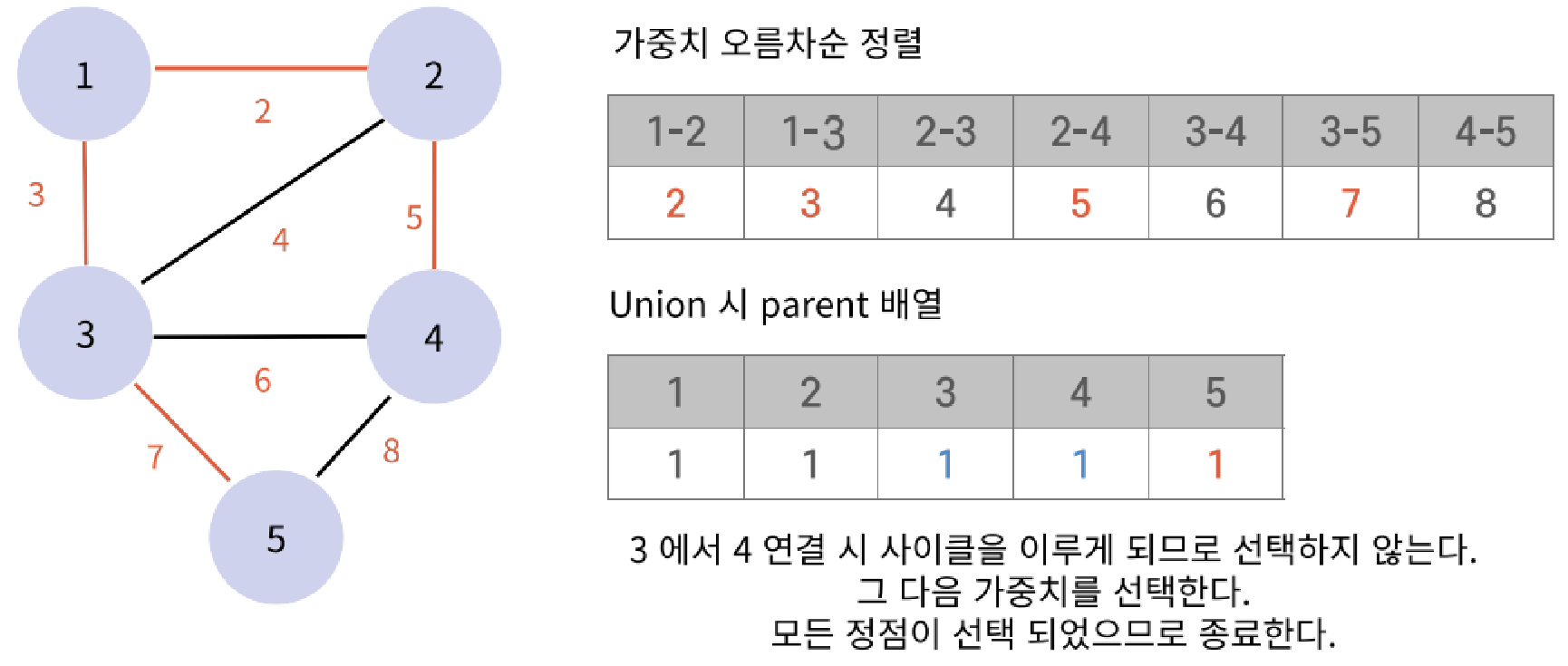 <!-- 2. 가중치 작은 간선부터 선택해나가는 작업 -->