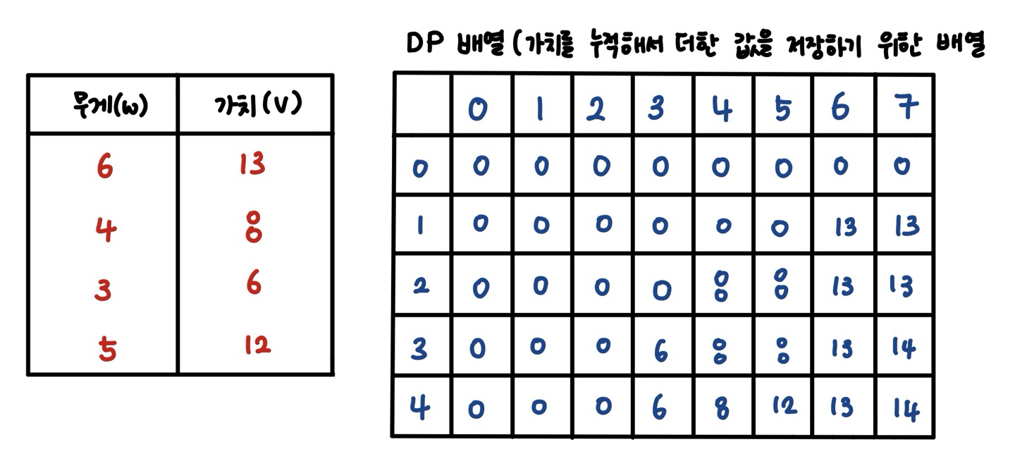 <!-- 각 물건에 대한 dp 배열의 행의 값을 채워 나가는 작업