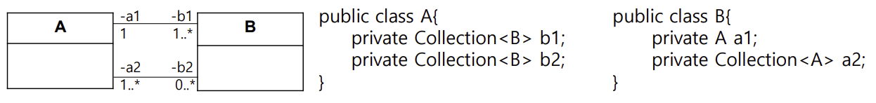 - 동일한 클래스 사이에 존재하는 복수 개의 연관관계