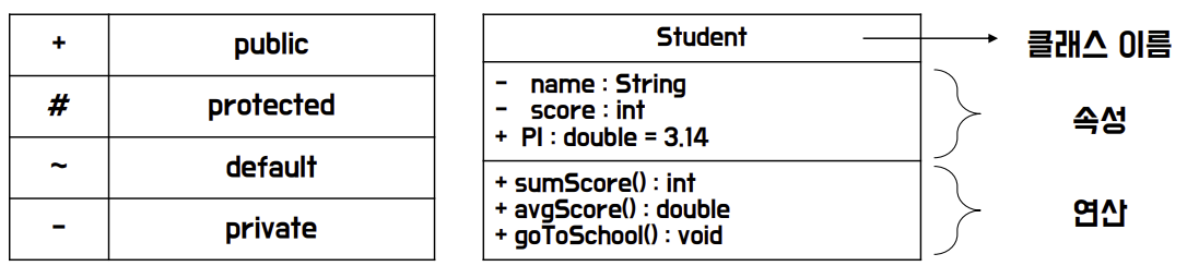 - 속성 : 클래스의 데이터 필드 / 연산 : 클래스가 수행하는 메서드(행위)