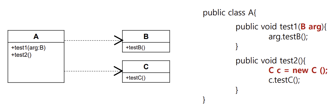 - 한 클래스가 다른 클래스의 기능(메서드 등)을 일시적으로 사용하는 경우