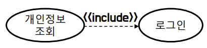 포함 관계 : 한 유스케이스가 다른 유크세이스의 기능을 포함하는 관계(반드시 해야만 하는 관계)