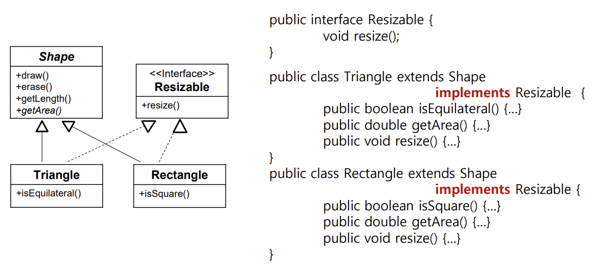 - 인터페이스에 명세 된 기능을 클래스에 의해서 구현한 관계