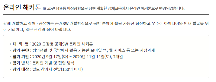 한번쯤은 꼭 해커톤 나가봐야지 결심했던 나에게 군대에서 해커톤이 진행된다는 소식은 반가운 소식이었고, 군대에서 그래도 나름대로 기본적인 프론트엔드 공부를 혼자서 해봤었고, 올해 열리는 해커톤이 참가자격이 주어지는 처음이자 마지막 기회였기에 신청하게 되었다.