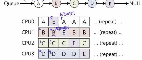 - CPU 개수가 증가할수록, 큐도 증가하기 때문이다.