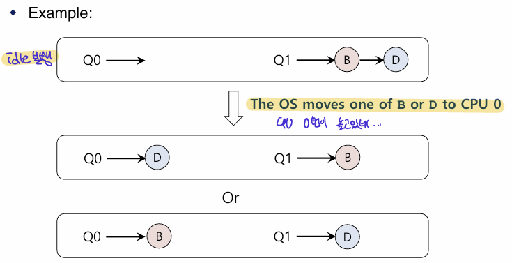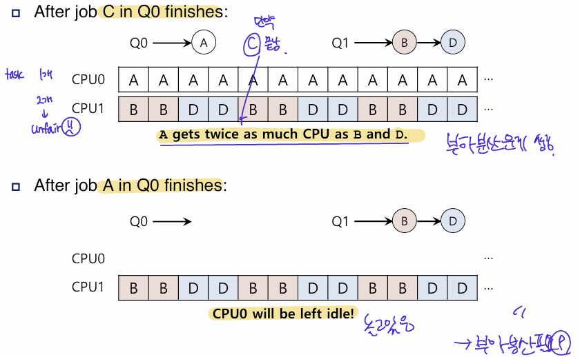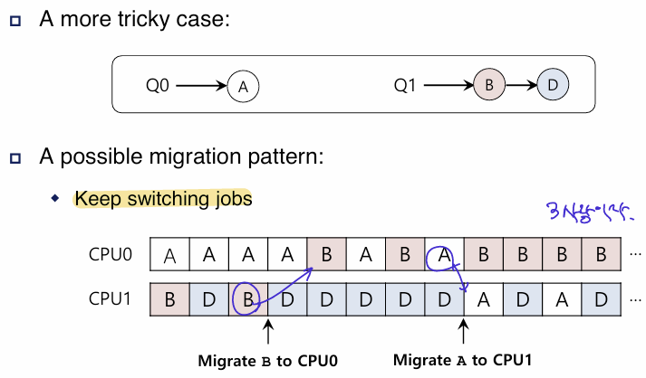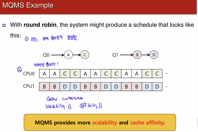 - 단일 queue 문제로 인해, MQMS는 큐도 여러개이다!(CPU 마다 각자 큐 가짐)