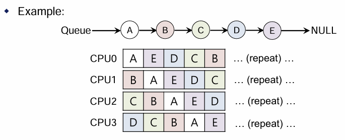 - 각 CPU는 global shared queue를 보고 다음 job을 고른다.