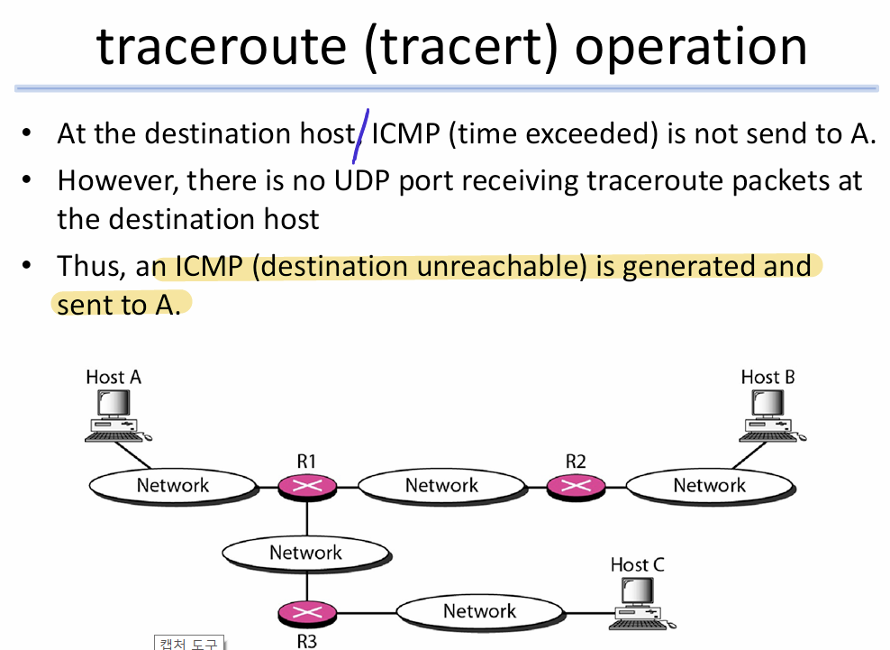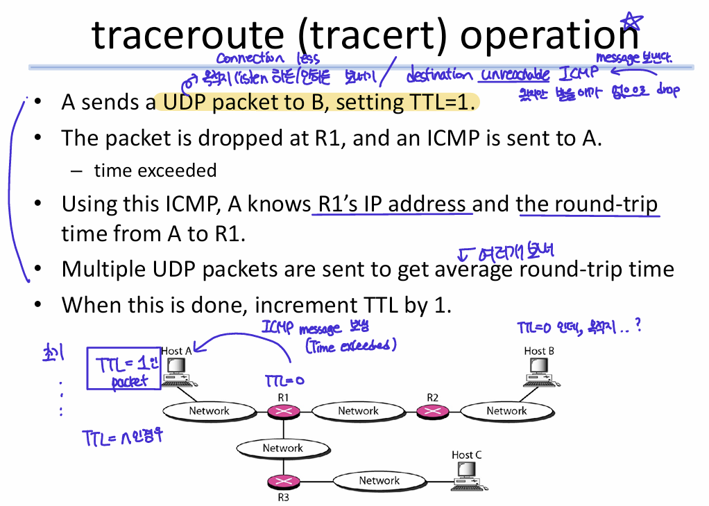 - 첫번째 traceroute message: TTL = 1 -> 첫번쨰 라우터 IP 주소 얻음
