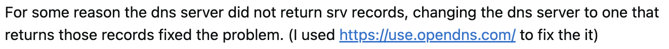 🙋♂️ 번역) "어떤 이유에서인지 DNS 서버가 SRV 레코드를 반환하지 않았습니다. DNS 서버를 해당 레코드를 반환하는 서버로 변경한 것이 문제를 해결했습니다. (저는 문제를 해결하기 위해 https://use.opendns.com/을 사용했습니다.)"