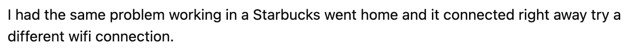 🙋♂️ 번역) "저도 스타벅스에서 작업할 때 같은 문제가 발생했는데, 집에 가자마자 바로 연결되었습니다. 다른 Wi-Fi 연결을 시도해 보세요."