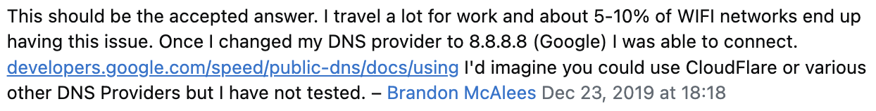 🙋♂️ 번역) "이 답변이 채택된 답변이 되어야 합니다. 저는 업무 때문에 이동이 잦고, 사용한 Wi-Fi 네트워크 중 약 5-10%에서 이 문제가 발생합니다. DNS 공급자를 8.8.8.8(구글)로 변경하니 연결할 수 있었습니다. CloudFlare나 기타 다른 DNS 공급자도 사용할 수 있을 거라고 생각되지만, 제가 테스트해보지는 않았습니다."