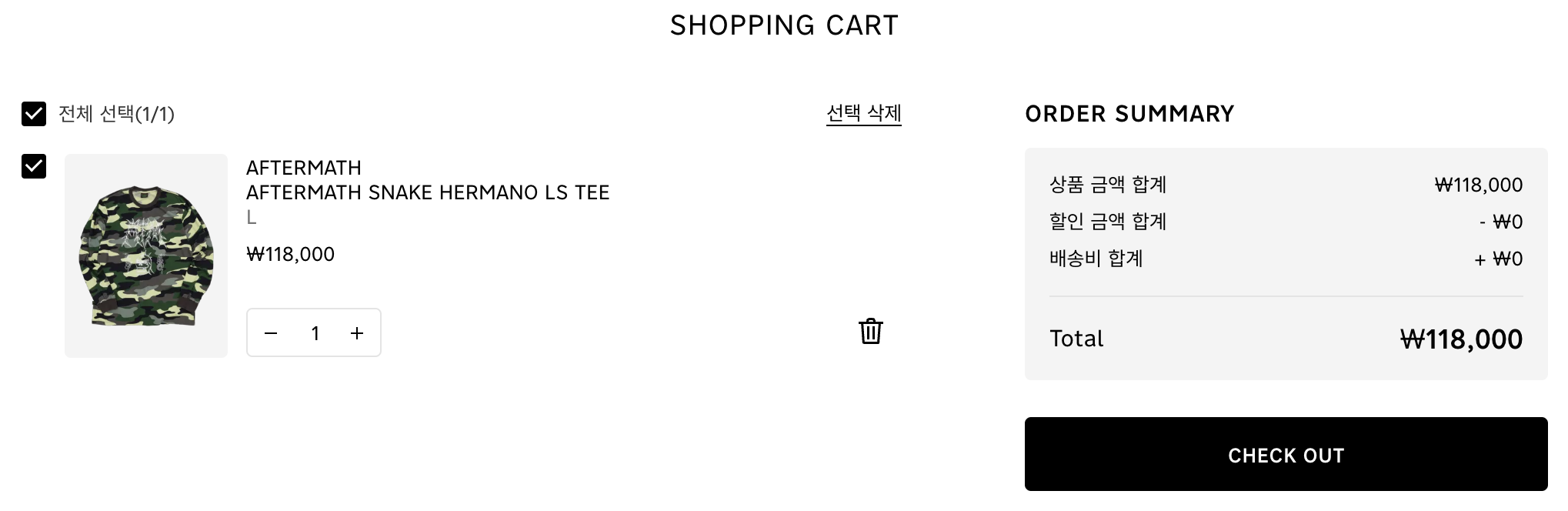 장바구니에 상품 한 개를 선택 후 담아보았다.