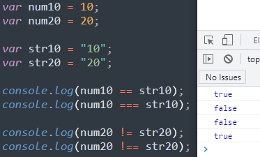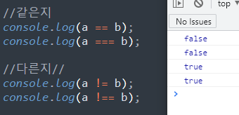 == vs === / != vs !== 의 차이: === & !==는 데이터 타입까지 완전히 동일한지 비교하는 엄격한 비교