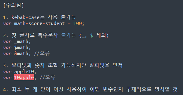 5. 예약어(JS에서 만들어져 있는var,typeof,function,null,undefined,true,console등)를 피할 것