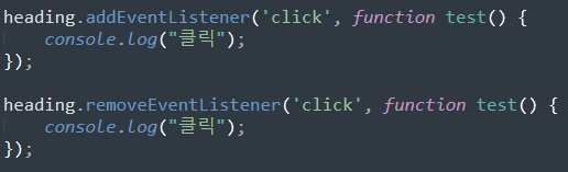 // 아래의 경우 함수명만 같을 뿐 다른 주소를 가진 각각의 함수이므로 remove 적용 안 됨