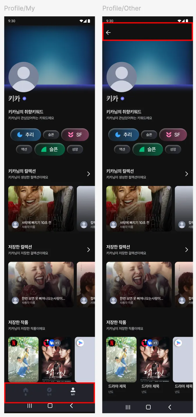 | 기본적으로 내 프로필과 타인 프로필 화면의 UI가 동일함 (들어가는 내용들) | 1. 내 프로필(My)에만 BottomBar 표시 2. 타인 프로필(Other)에만 뒤로가기 버튼 표시 3. My/Other에 따른 다른 API 호출 (userId 처리 방식) |