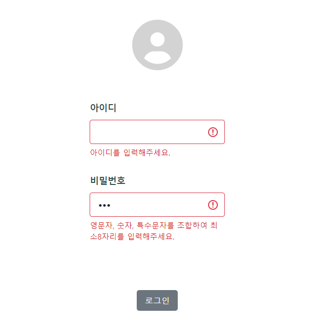 로그인 버튼을 누르기 전 반응형으로 field를 검사하기 때문에 바로바로 화면에 에러메세지가 출력된다.