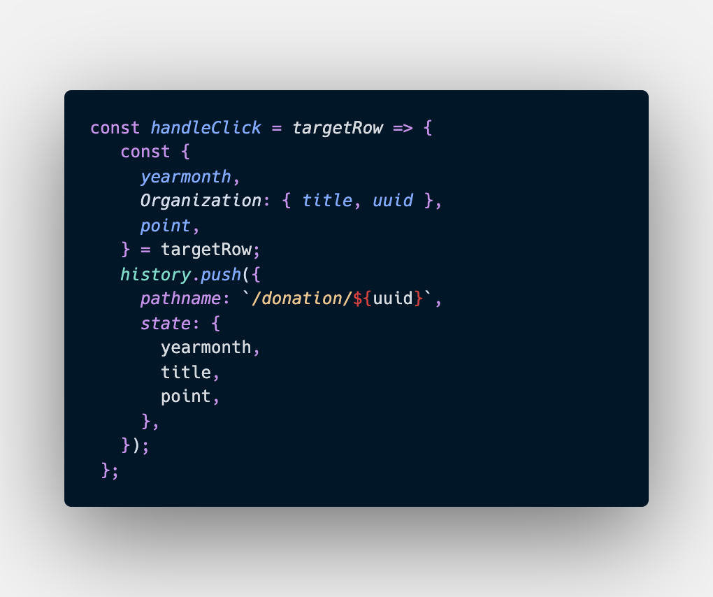 상세 페이지 이동시 기관명, 기부년월, 기부 포인트를 상세페이지에 prop로 넘겨주고 싶어요