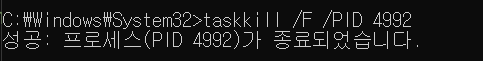 수신 대기 포트 부분을 보면 포트가 3306인 것이 존재할 것이다 PID 번호를 확인한 후 cmd창으로 이동한다