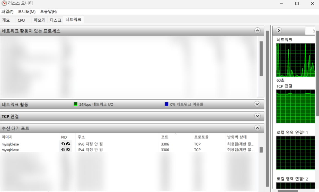 Win+R 단축키를 사용해서 실행이라고 적힌 창이 뜨면 resmon.exe라고 입력한다 (리소스 모니터를 검색해서 접속하는 방법도 있다) 접속하면 아래의 화면이 뜬다