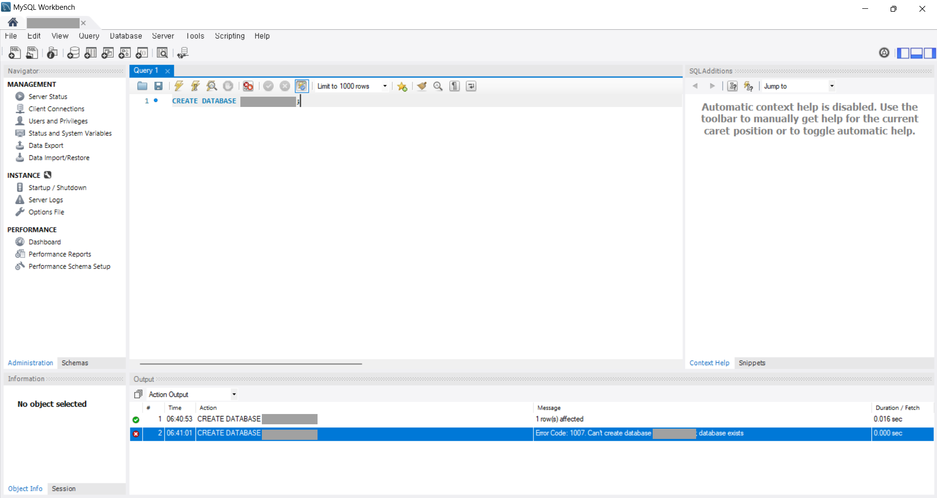 너무 신나서 데이터베이스를 두번 생성했더니 에러가 난 모습을 볼 수 있다 ㅎㅎ
