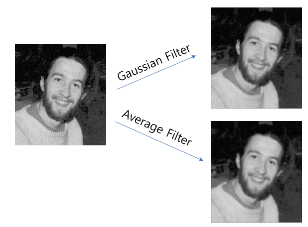 가우시안 필터는 origin pixel에 더 많은 가중치를 부여하기 때문에 Average filter보다 blur 강도가 약하다