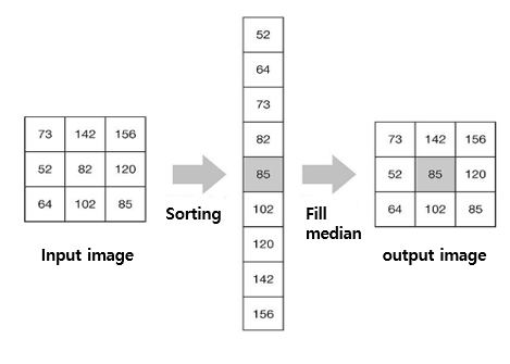 salt noise(밝은 노이즈)와 pepper noise(어두운 노이즈)를 지우는 데에 효과적이다