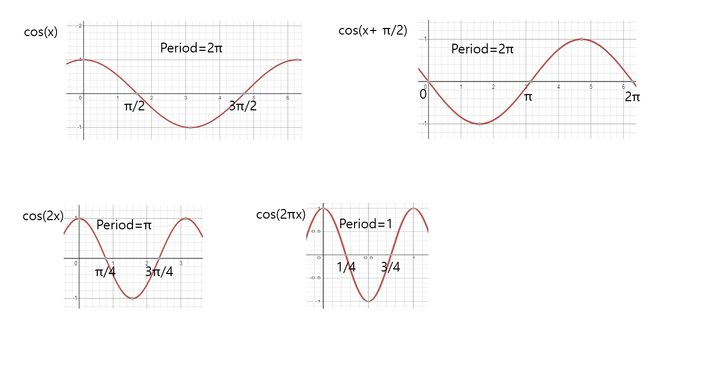 cos(x) cos(x+π/2) cos(2x) cos(2πx) (π is pi)