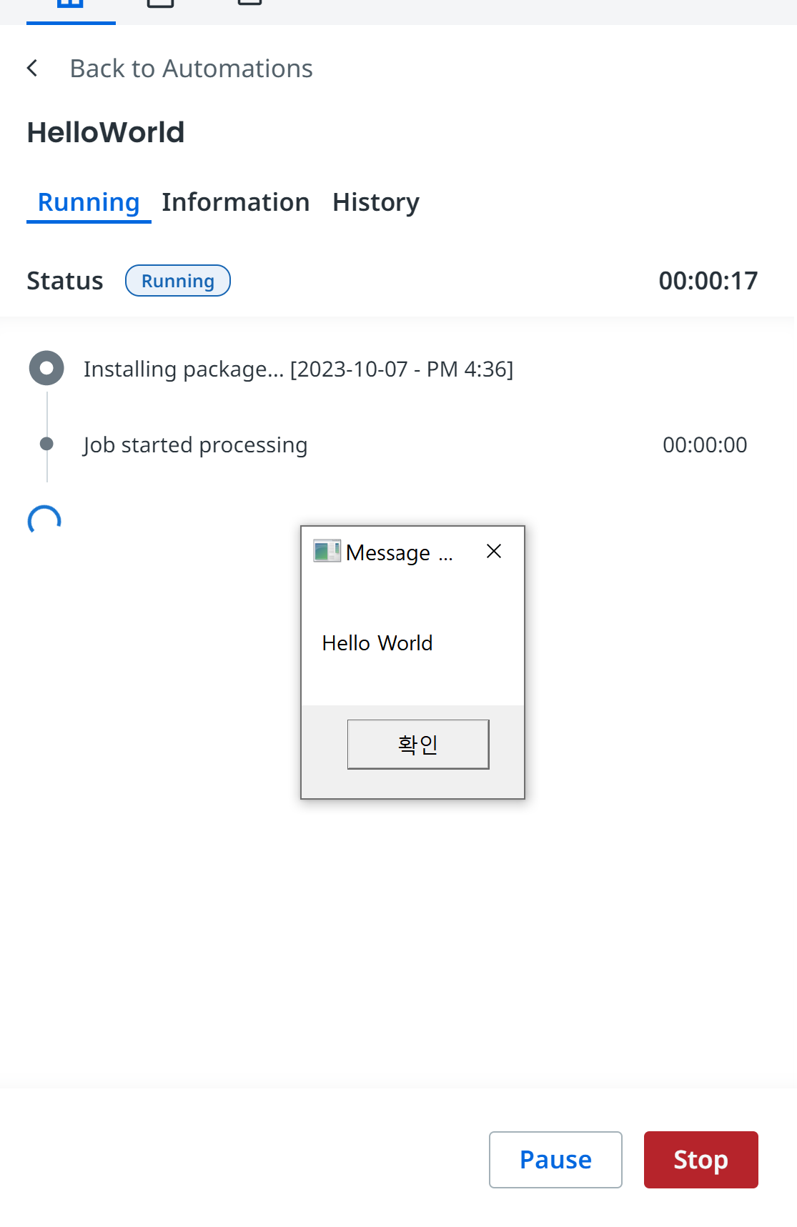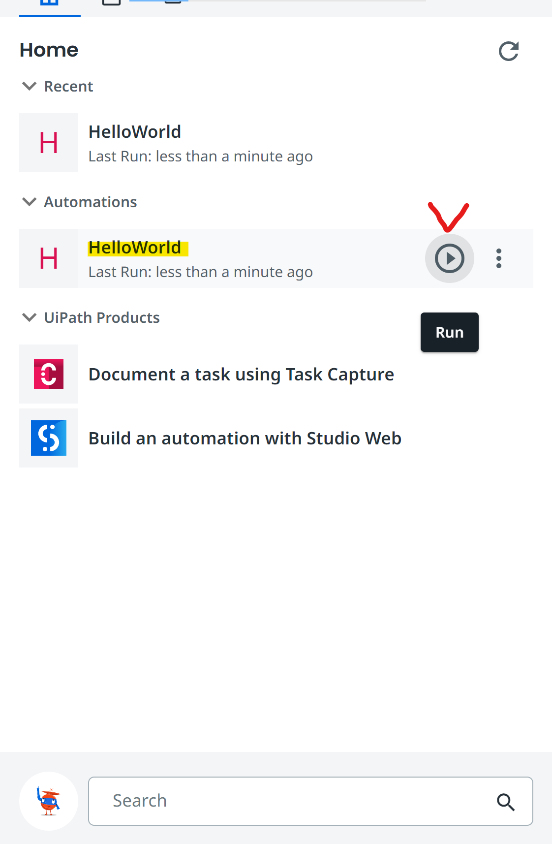 UiPath Assistant애플리케이션을 열게 되면 방금 오케스트레이터에 올린 HelloWorld프로세스가 확인된다.
