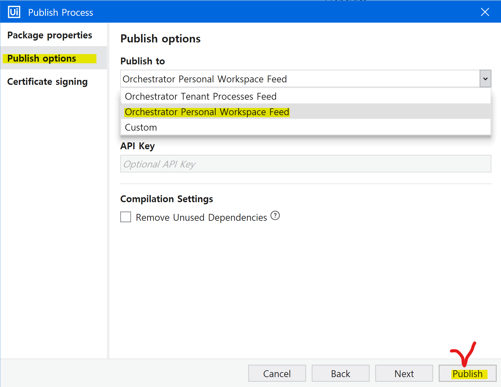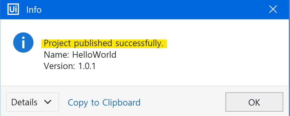 - Studio를 Orchestrator에 연결하면 전용 피드를 통해 자동화 프로젝트를 NuGet패키지로 쉽게 게시할 수 있습니다. 거기에서 실행될 로봇에 배포됩니다.