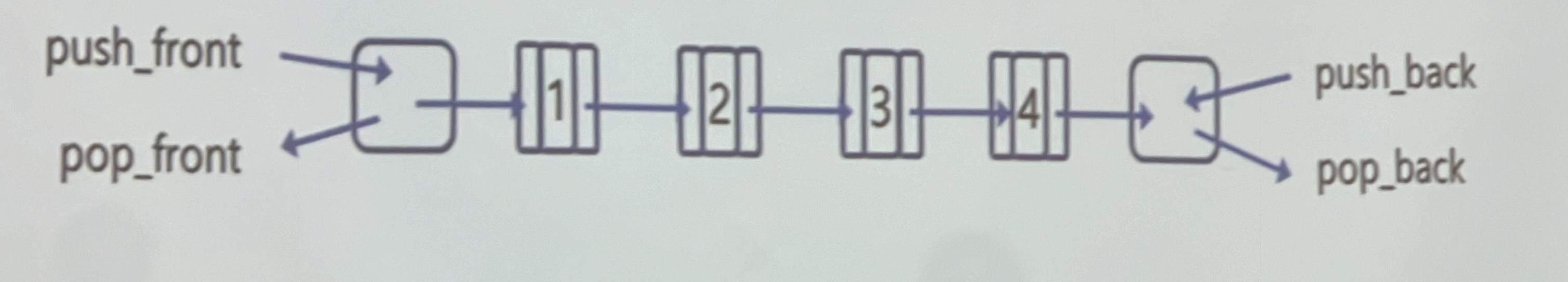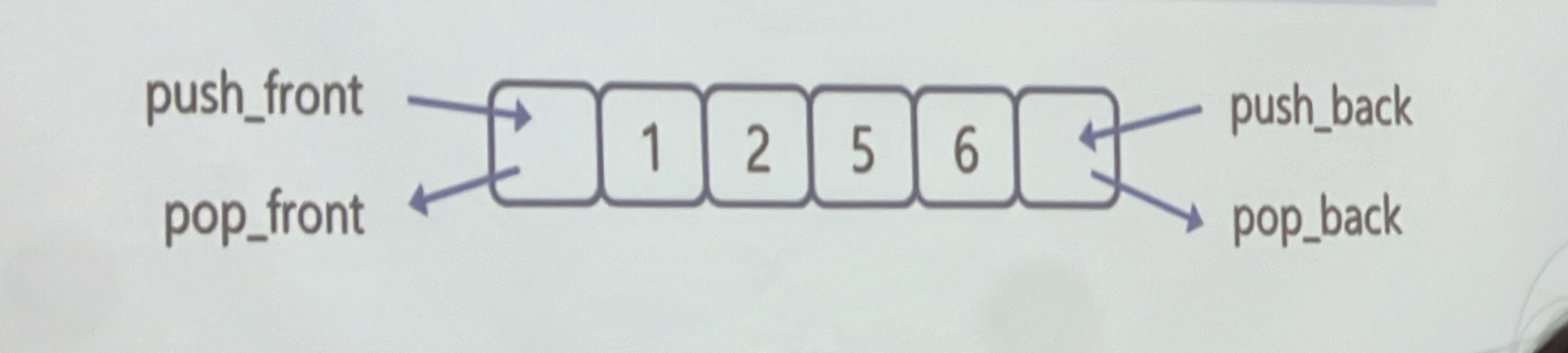 Deque 또는 Double-Ended Queue는 양쪽 끝에서 데이터를 삽입 및 삭제할 수 있는 시퀀스 컨테이너