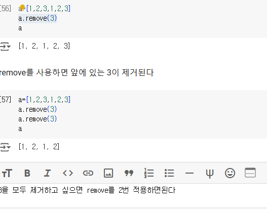 배열요소 지우는 방법 ( del, remove, pop)등이 있다