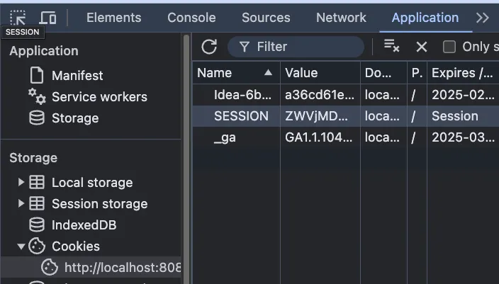 Spring Boot를 사용하면, Spring Boot 프로젝트에 내장되어 있는 Tomcat 서버가 세션을 생성. 이때, 이 세션을 확인하고 싶다면, Chrome의 개발자 모드로 들어가, Application > Storage > Cookie를 확인