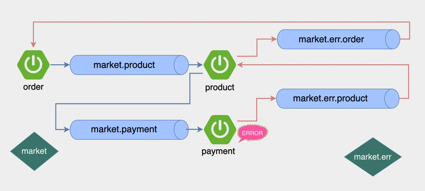 payment queue에 대해서 컨슈머이며 product error queue에 대해서는 프로듀서이다.