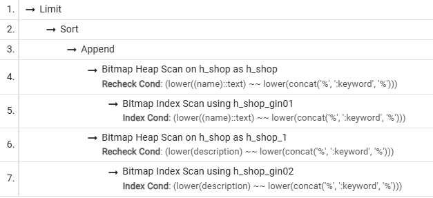 like 문자열 검색에 대한 조회 성능을 위해 GIN 인덱스. Ignore case를 위해 LOWER를 입혀 함수 기반으로 동작하도록 했다.