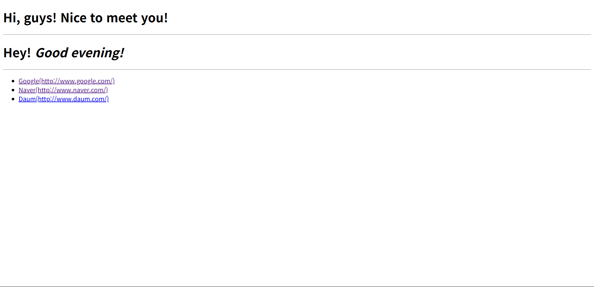 <!DOCTYPE html> <html lang="ko"> <head> <meta name="viewport" content="width=device-width"> <meta charset="UTF-8"> <!-- <link rel="stylesheet" href="https://meyerweb.com/eric/tools/css/reset/reset.css"> --> <title>innerHTML</title> </head> <body> <h1 id="hi">Hi, guys!</h1> <script> // #hi 요소의 내부 텍스트 뒤에 " Nice to meet you!" 문자열을 추가 // → 1. DOM에서 #hi 요소를 표현하는 HTMLElement 객체를 탐색 // 2. HTMLElement 객체의 innerHTML 속성으로 HTML 요소의 내부 마크업을 설정 // 1. DOM에서 #hi 요소를 표현하는 HTMLElement 객체를 탐색 var hi = document.getElementById('hi'); console.log('hi.innerHTML = ' + hi.innerHTML); console.log('hi.innerText = ' + hi.innerText); console.log('hi.textContent = ' + hi.textContent); // 2. HTMLElement 객체의 innerHTML 속성으로 HTML 요소의 내부 마크업을 설정 // hi.innerHTML = hi.innerHTML + ' Nice to meet you!'; hi.innerHTML += ' Nice to meet you!'; </script> <hr> <h1 id="hey">Hey!</h1> <script> // "Good evening!" 문자열을 내부 텍스트로 가지는 <i> 요소를 #hey 요소에 추가 // 1. DOM에서 #hey 요소를 표현하는 HTMLElement 객체를 탐색 // var hey = document.getElementById('hey'); // 2. HTMLElement 객체의 innerHTML 속성으로 HTML 요소의 내부 마크업을 설정 // hey.innerHTML = hey.innerHTML + ' <i>Good evening!</i>'; // hey.innerHTML += ' <i> Good evening!</i>'; // hey.textContent += ' <i>Good evening!</i>'; // → Hey! <i>Good evening!</i>; document.getElementById('hey').innerHTML += ' <i>Good evening!</i>'; // id가 hey인 요소를 찾아 parents에 대입 // var parents = document.getElementById('hey'); // i요소를 만들어 child에 대입 // var child = document.createElement('i'); // child의 innerText에 'Good Evening' 대입 // child.innerText = 'Good Evening!' // parents의 끝에 child를 추가 // parents.appendChild(child); // console.log(parents.innerHTML); </script> <hr> <ul id="list"> <li><a href="http://www.google.com">Google</a></li> <li><a href="http://www.naver.com">Naver</a></li> <li><a href="http://www.daum.com">Daum</a></li> </ul> <script> // #list 요소에 있는 <a> 요소들의 내부 텍스트 뒤에 참조 URL을 덧붙임 // 1. DOM에서 <a> 요소들을 표현하는 HTMLElement 객체들을 탐색 var links = document.querySelectorAll('#list > li > a'); // 반복문으로 배열 links의 원소들, 즉 HTMLElement 객체에 차례대로 접근 for(var i = 0; i <links.length; i++){ // 2. HTMLElement 객체의 속성이나 메서드로 HTML 요소의 href 속성 값을 참조 // var href = links[i].getAttribute('href'); // var href = links[i].href; // 3. HTML 요소의 href 속성 값을 HTML 요소의 내부 텍스트 뒤에 덧붙임 // links[i].innerHTML += ` (${href})`; links[i].innerHTML += `(${links[i].href})` } </script> </body> </html>