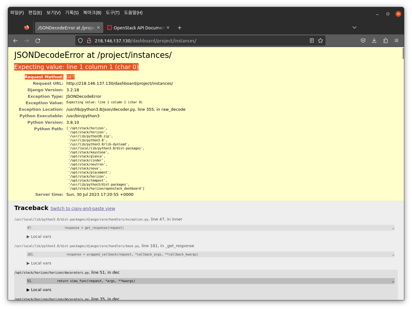 오픈스택 생성 후 인스턴스 탭 클릭후 오류가 뜬다. 뭐가 문제였나 찾아보니 openstack을 껏다 키면 다시 원할하게 사용할 수 있다고 한다.