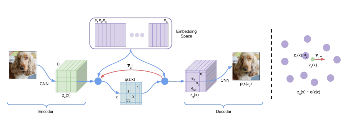 참고로 헷갈릴만한 요소로 ze(x) 는 encoder로 continous vector space를 가지고 zq(x)는 decoder에서 사용하는 것으로 ze(x)의 값을 가장 가까운 codebook으로 매핑한 값이다.