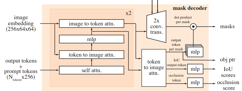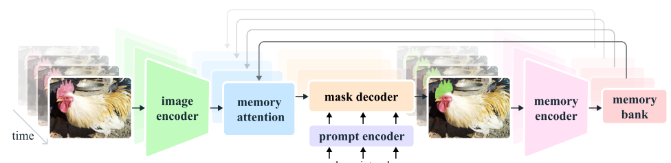 model components 로는 SAM과 같이 Image encoder, prompt encoder, mask decoder를 가지고 memory bank를 위해 memory attention, memory encoder를 가지고 있다.