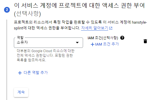 권하는 어떤것이 최소 권한인지 확인 하기 귀찮으므로 소유자로 설정 후 완료를 눌러 서비스 계정 생성은 완료한다.