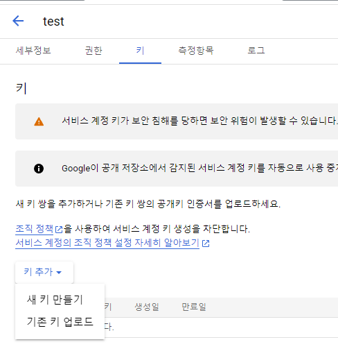 생성된 서비스 계정을 클릭해 사진에서 키 탭에 접근해 키 추가 JSON 키로 만들고 만들고 있는 Spring 프로젝트 resources 폴더에 넣는다. (뭐 폴더를 추가해 넣든 맘대로)