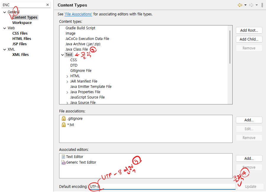 Content Types -> text 클릭 -> Default encoding : UTF-8 입력 -> Update